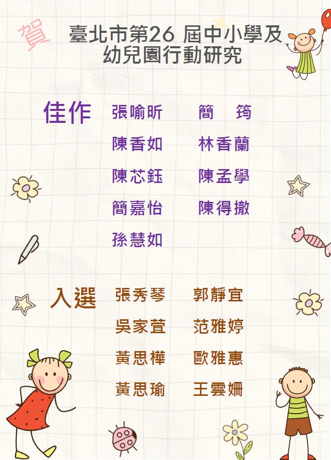 台北市第26屆中小學及幼兒園行動研究 佳作 張喻昕 簡筠 陳香如 林香蘭 陳芯鈺 陳孟學 鄭玉玲 入選 張秀琴 郭靜宜 吳家萓 范雅婷 黃思樺 歐雅惠 黃思瑜 王雲姍
